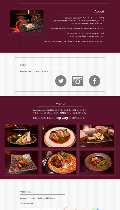 ダイニングバーのサイトを新規で企画からデザイン、マークアップまで一貫して担当しました。バーの雰囲気は残しつつ、売りである料理にも注目してもらえるよう心がけました。かなりシンプルなデザインです。